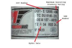 Каждый металлокомпозитный баллон, обмотанный углеродным волокном, имеет ярлык сбоку. Каждый металлический баллон имеет соответствующую информацию в виде штампа вблизи верхней части баллона. Если вы посмотрите на изображение справа вы заметите DOT номер . DOT номер это номер, который выделяется определенной серии баллонов, чтобы сделать их легко идентифицируемыми для министерства транспорта. Справа от DOT Номера указывается Максимальное рабочее давление, в данном случае это 4500 psi (Прим перевод. psi — фунты на кубический дюйм, 4500 psi ~ 310 бар). Так что этот конкретный баллон способен удержать давление в 4500 PSI. Ниже DOT Номера Канадский эквивалент DOT номера и справа максимальное рабочее давление в барах (1 Бар равен 14,508 PSI, так что 14,508 X 310 = 4497,48 PSI, что достаточно близко к 4500 PSI) . Еще ниже находятся, серийные номера производителя баллона. Под серийными номерами находятся дата последней переопрессовки (или дата производства). В зависимости от баллона (некоторые должны быть испытаны каждые три года, а некоторые раз в пять лет), как правило, он должен быть испытан по истечении трех лет после Дата гидротеста. Для баллона на рисунке, он должен быть перепроверен в декабре 2007 года. Если бы на ярлыке значилось бы пять лет, баллон должен быть проверен на гидротесте в декабре 2009 года. Каждый металлокомпозитный баллон может использоваться максимум 15 лет. В 2019 этот баллон придется уничтожить, так как срок его использования истек.
